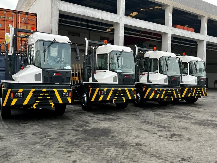 ⚓️ Kribi Conteneurs Terminal a mis en service quatre nouveaux tracteurs portuaires. Equipés d’un puissant moteur, ils ont la particularité de déplacer des charges lourdes pouvant aller jusqu’à 50 tonnes. Ces nouvelles acquisitions viennent s’ajouter aux 14 autres tracteurs portuaires déjà opérationnels sur le terminal.